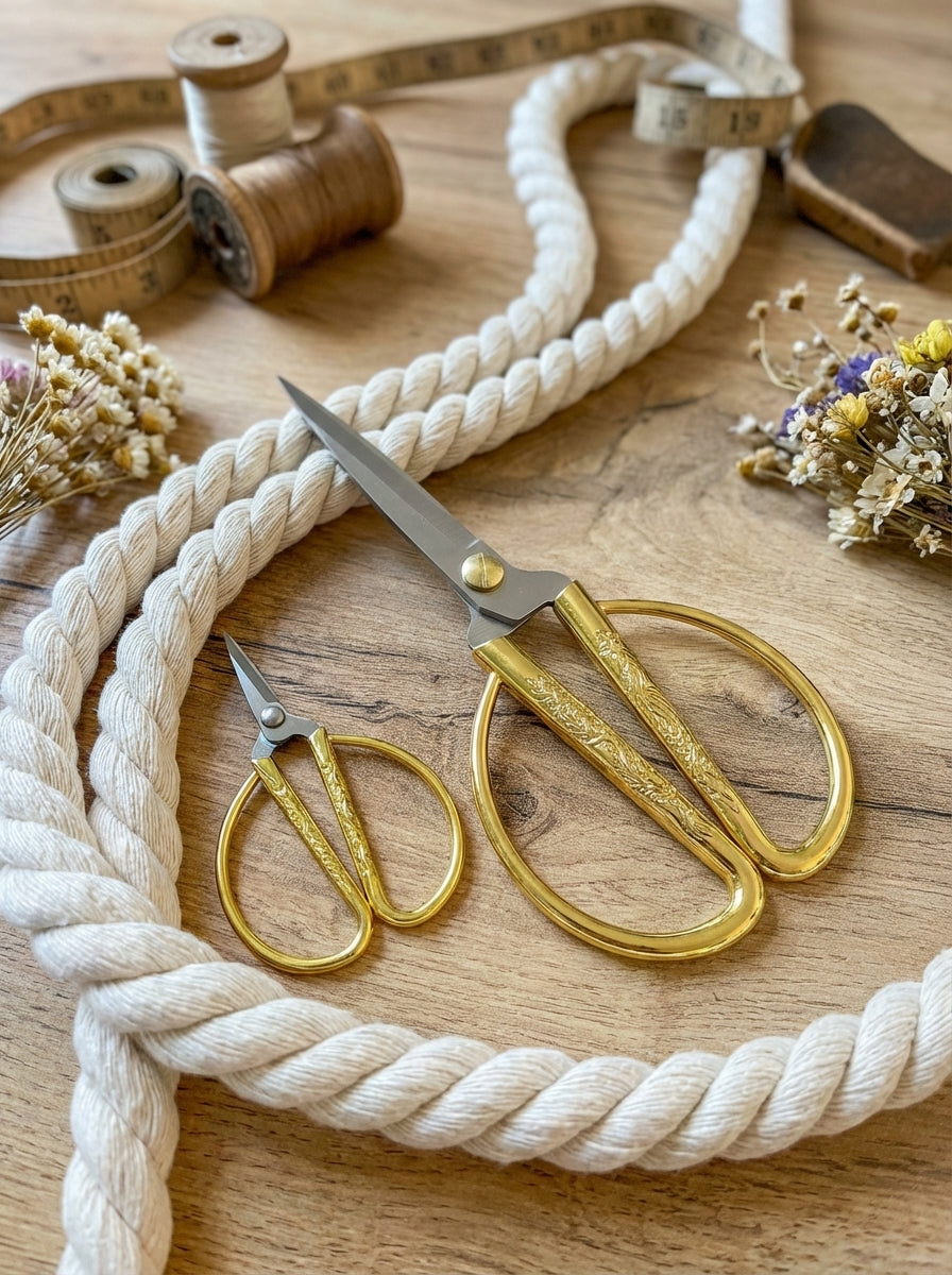 Zlaté nůžky jsou vaše oblíbené a jsou vhodné na pečlivé stříhání. Čistě odstříhnou a zastřihnou macramé přízí (velikost S), ale i bavlněné lano na duhu (velikost L).