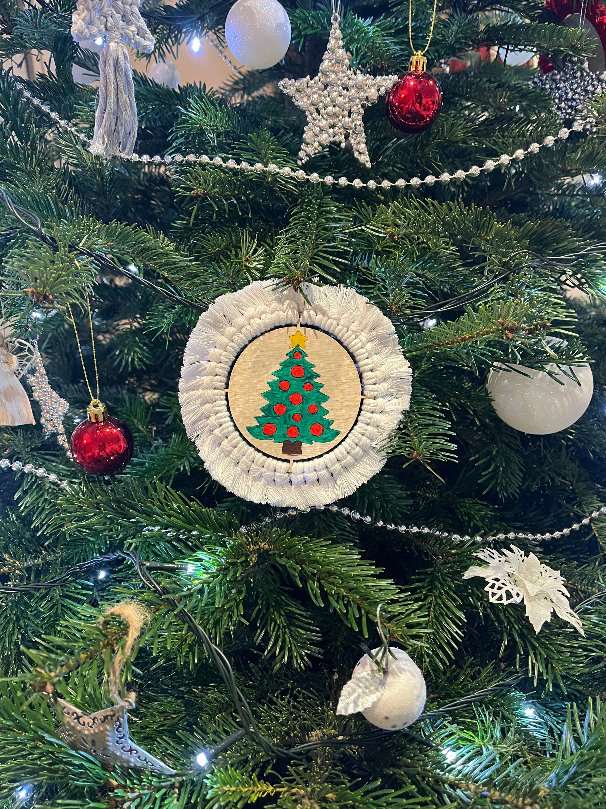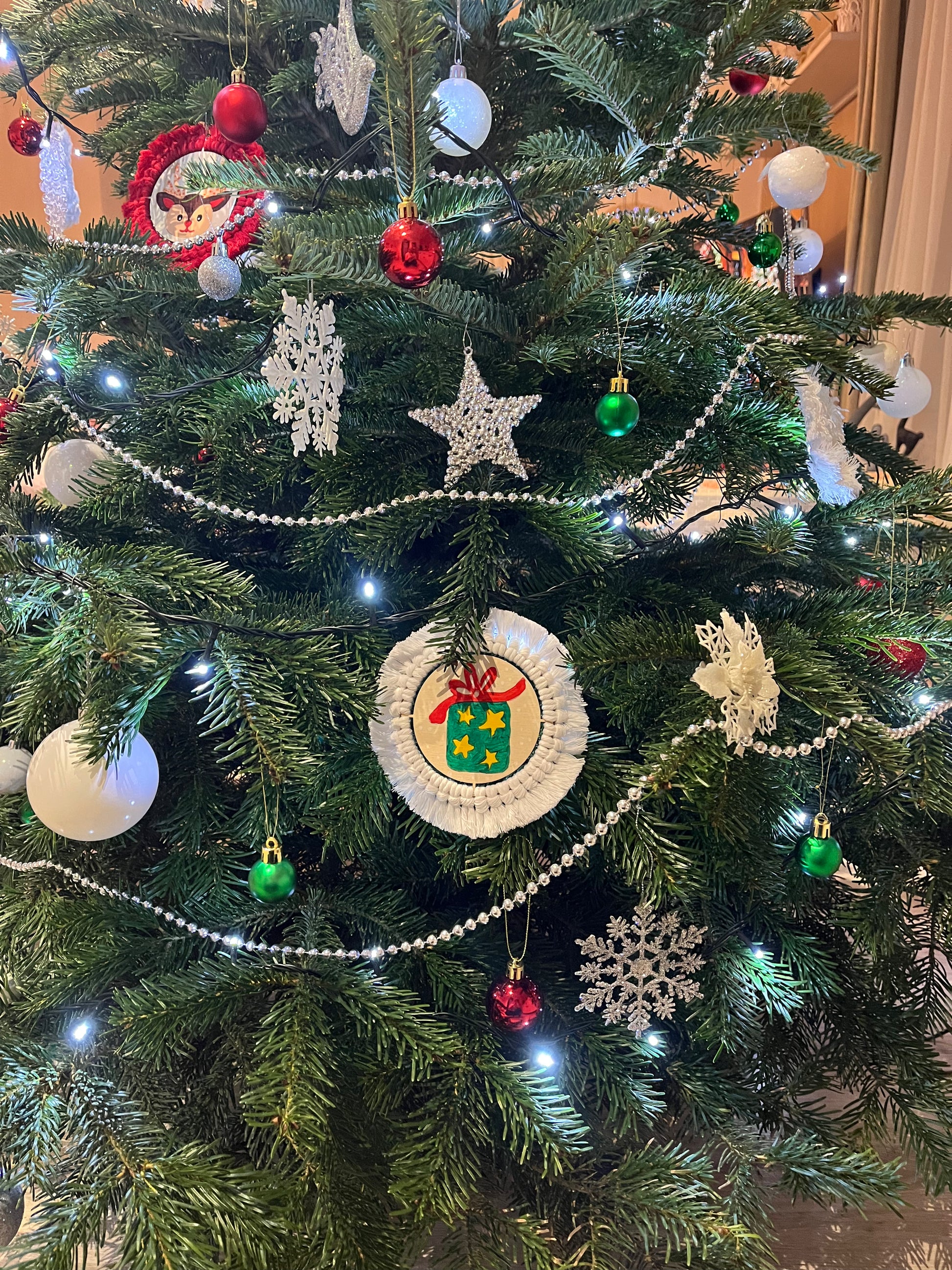 - Každý výřez má malou dírku na provléknutí háčku na stromeček. Pokud budete ozdoby používat třeba jako vánoční podtácky, tak přes přízi není dírka vidět.