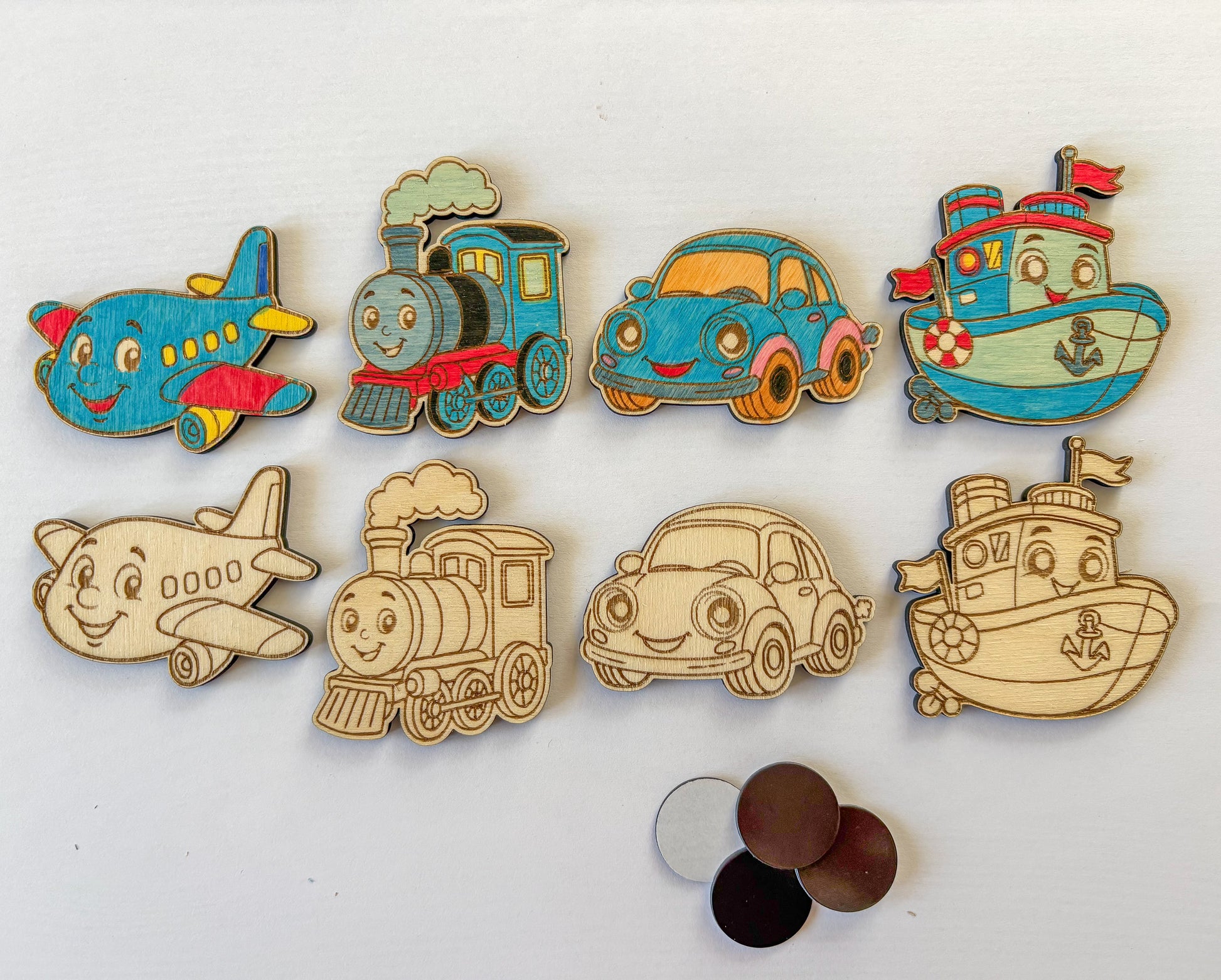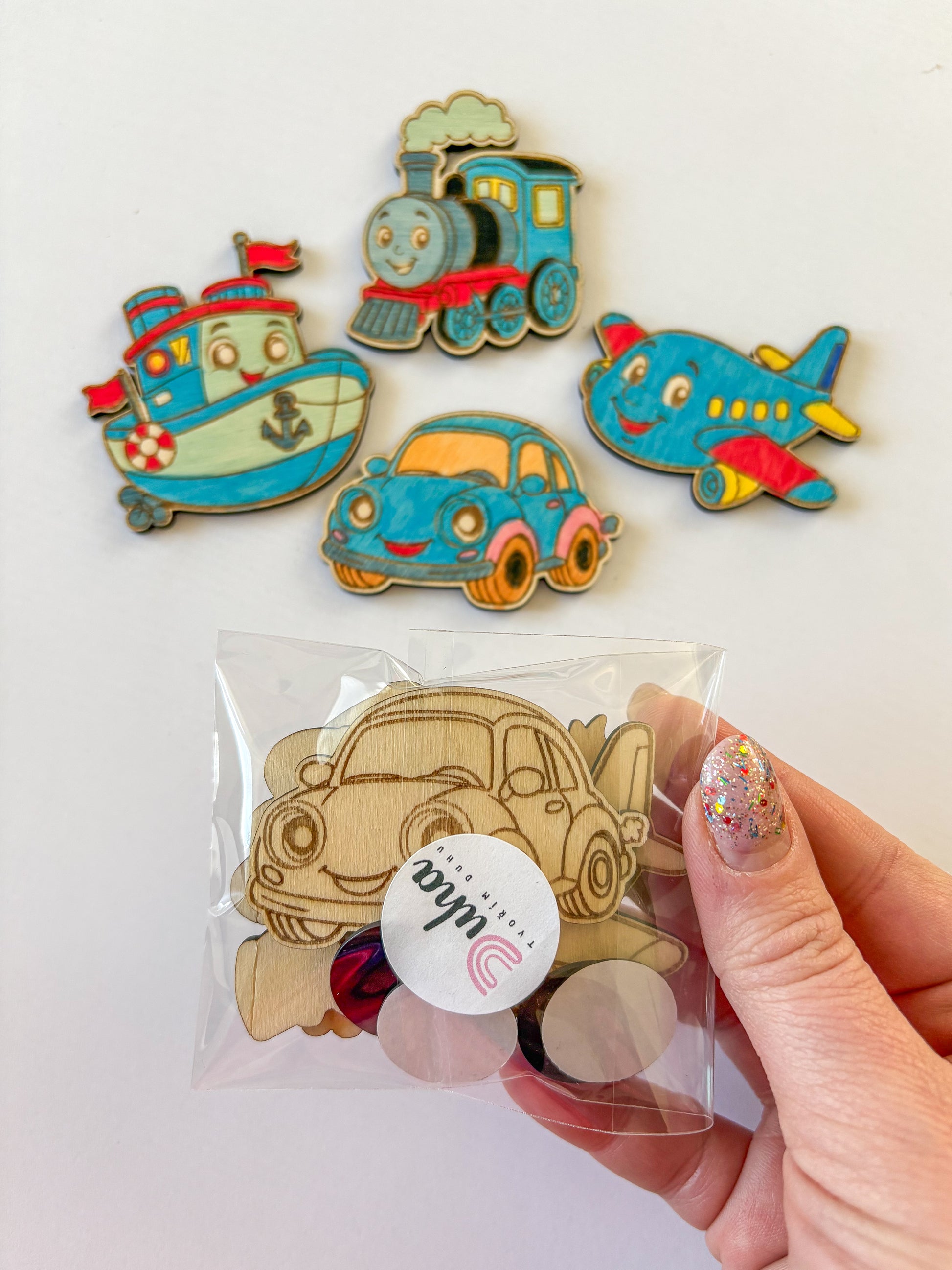 SADA OBSAHUJE:všechny 4 motivy dřevěných výřezů DOPRAVA + 4 samolepící magnetky. Zabaleno v pytlíčků pro použití jako malý dárek pro děti, vnoučata, kamarády, do školky/školy nebo na dětskou oslavu pro zpestření programu.