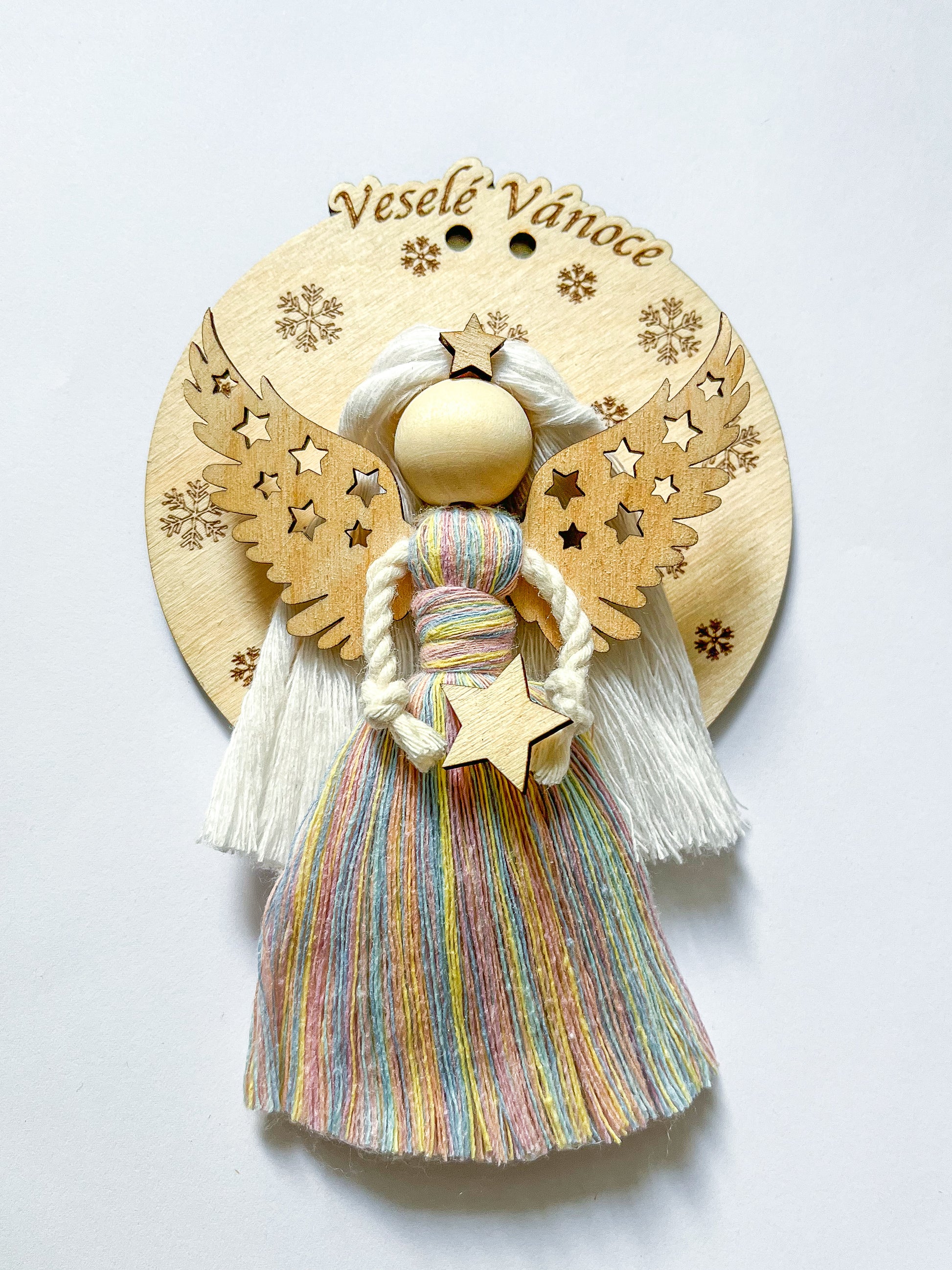 Dřevěný výřez v podobě kolečka z mojí vlastní dílny jako podklad pod Macramé andělku. Poklad má vždy dvě dírky pro pohodlné zavěšení.